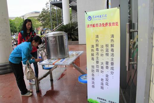 春季各类流感肆虐,据我处医保中心工作人员介绍,中药在预防流感方面会比西药更有效,此次必赢集团网站针对H7N9禽流感,在汤中加入了板蓝根、藿香、金双花、淡竹叶、大青叶、老连翘等传统的中草药药材成分,达到清热解毒,预防流感的功效。在饮用服务点,记者看到后勤部门的工作人员贴心地为师生准备了纸杯,一旁竖立的宣传板上也对H7N9型禽流感的病状等相关情况进行了简要介绍,前去领取清热解毒汤的同学们纷纷对必赢集团网站后勤部门的工作人员表示感谢。