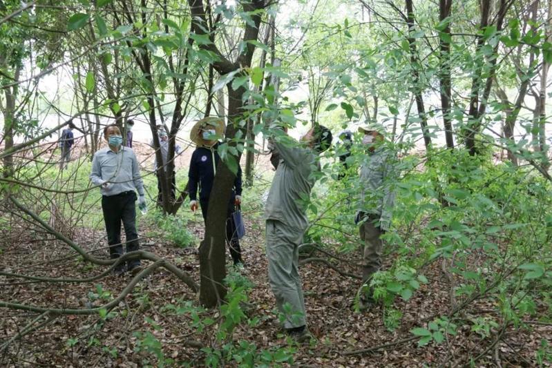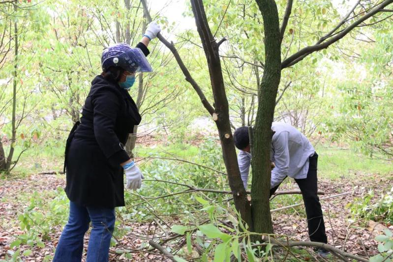 大家互相配合、齐心协力,整个樟树林里呈现出一派热火朝天的劳动场面,经过志愿者们五个多小时的奋战,十余亩的樟树林修剪完成。